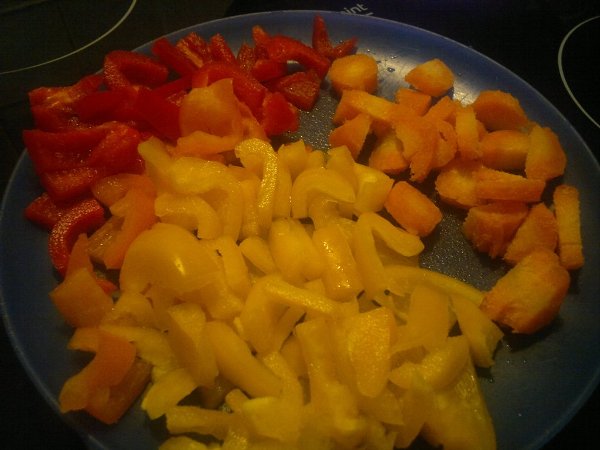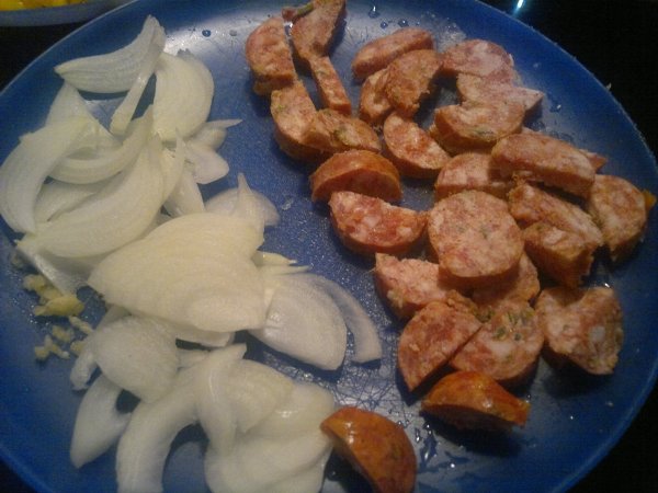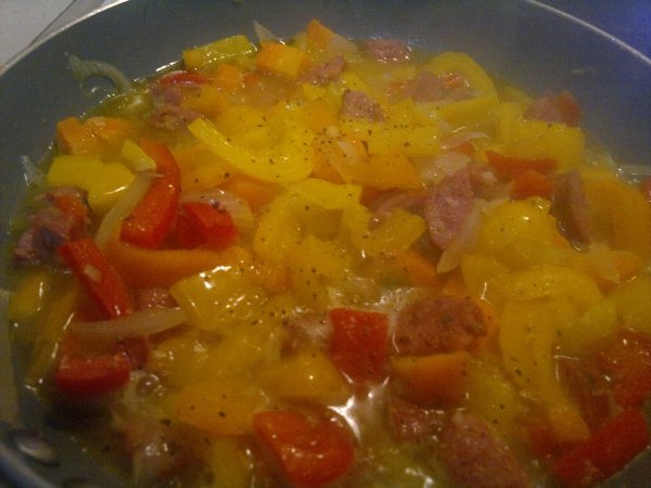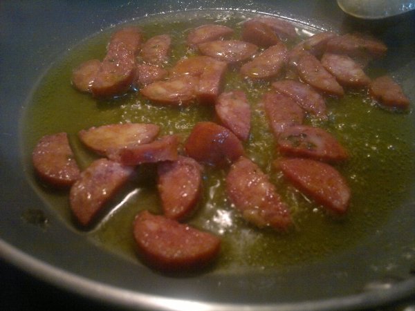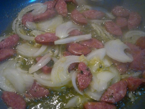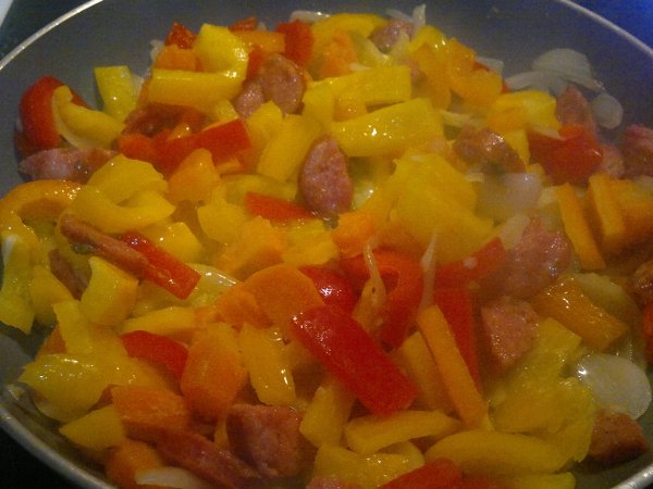 Βάλτε τα φασόλια από την προηγούμενη μέρα σε νερό να φουσκώσουν. Βράστε τα σε μπόλικο νερό για 1 ώρα, σουρώστε τα και βάλτε τα σε ένα ταψάκι. Κόψτε τα λαχανικά και το λουκάνικο σε λωρίδες ή κύβους και λιώστε το σκόρδο. Σε ένα τηγάνι βάλτε λάδι και σοτάρετε το λουκάνικο. Μόλις πάρει χρώμα, ρίξτε τα κρεμμύδια και το σκόρδο. Ανακατέψτε και μόλις πάρει χρώμα το κρεμμύδι ρίξτε τα καρότα και τις πιπεριές. Όταν μαλακώσουν αρκετά, ρίξτε το κρασί. Μόλις εξατμιστεί το κρασί, προσθέστε την ντομάτα, τον κύβο, μισό ποτήρι νερό, αλάτι και πιπέρι. Μόλις πάρει μία βράση η σάλτσα ρίξτε το σέλινο ανακατέψτε και περιχύστε τα φασόλια. Προσθέστε νερό αν χρειάζεται ώστε να καλυφθούν τα φασόλια. Ψήστε στον αέρα στους 200 βαθμούς για περίπου 45 λεπτά, ανάλογα με τα φασόλια.