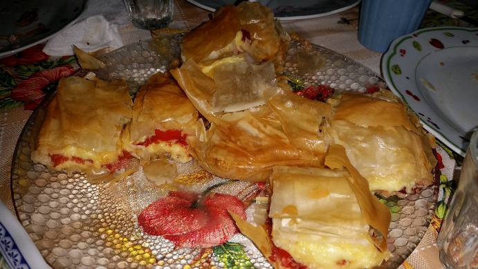 Λαδώνουμε ένα ταψί και απλώνουμε τα φύλλα, λαδώνοντας τα με ένα πινέλο. Τα αφήνουμε να προεξέχουν από το ταψί, για να καλύψουμε την πίτα μας στο τέλος. Απλώνουμε το gouda, βάζουμε από πάνω τον παστουρμά, τις ντομάτες, προσθέτουμε πιπέρι, κύμινο και ελάχιστο αλάτι. Απλώνουμε το ρεγκάτο και καλύπτουμε τη γέμιση με τα φύλλα που περισσεύουν από το ταψί, λαδώνοντας τα καθώς τα κλείνουμε. Χαράζουμε τα κομμάτια της πίτας με ένα μαχαίρι χωρίς να κόψουμε μέχρι κάτω και ψήνουμε στο φούρνο στους 180 βαθμούς για 45 λεπτά.