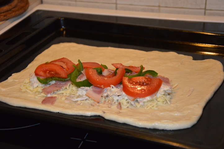 Λαδώνετε ελαφρώς μια λαμαρίνα του φούρνου, και παίρνετε μιά μπάλα από τη ζύμη, σε μέγεθος όσο 2 μπαλάκια του τένις. Ανοίγετε τη ζύμημέσα στη λαδωμένη λαμαρίνα, έτσι ώστε να σχηματιστεί ένα τετράγωνο. Στη μία άκρη του, από πάνω μέχρι κάτω βάζετε 1/4 από κάθε υλικό. Στη συνέχεια σκεπάζετε την πίτσα και συνεχίζετε με το υπόλοιπο ζυμάρι. Εγώ φτιάχνω 4 πίτσες με τη συνταγή για ζύμη πίτσας που σας προτείνω. Ψήνετε τις πίτσες για 30 έως 40 λεπτά και απολαμβάνετε!