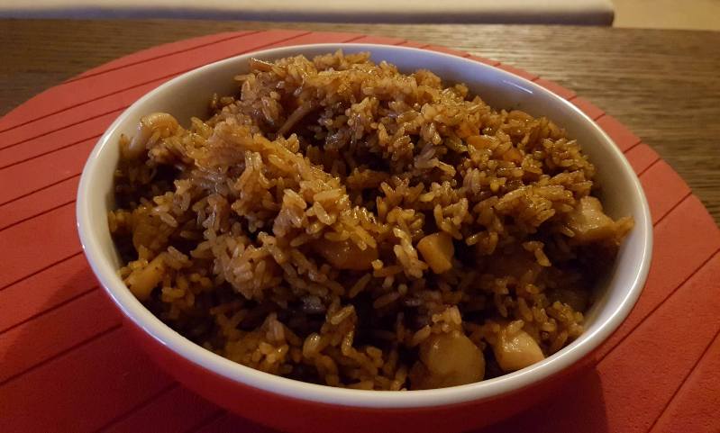 Σε ένα γουόκ ή σε ένα αντικολλητικό τηγάνι βάζουμε το σπορέλαιο και σωτάρουμε τις πιπεριές, το καρότο και το κρεμμύδι. Μόλις μαλακώσουν ρίχνουμε τις γαρίδες και μόλις πάρουν χρώμα προσθέτουμε και το καλαμάρι. Μόλις πάρει χρώμα προσθέτουμε το ρύζι και ανακατεύουμε συνεχώς να "λαδωθεί" καλά. Έπειτα ρίχνουμε τη σόγια, συνεχίζουμε να ανακατεύουμε για 4-5 λεπτά και σερβίρουμε.