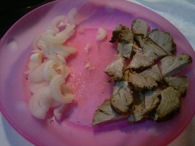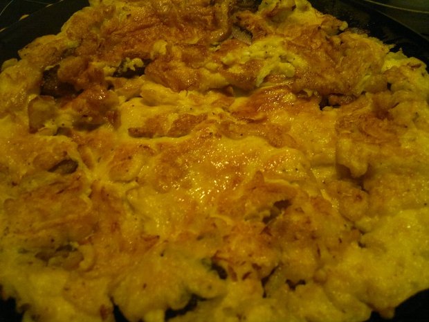 Σε ένα τηγάνι βάζουμε λίγο λάδι, τσιγαρίζουμε το κρεμμύδι και προσθέτουμε το απάκι. Σε ένα μπολ σπάμε τα αυγά, προσθέτουμε το γάλα, το αλεύρι, αλάτι και πιπέρι. Τα χτυπάμε καλά να λιώσει το αλεύρι και ρίχνουμε το μείγμα στο τηγάνι. Ψήνουμε την ομελέτα μας από τη μία πλευρά τρυπώντας με ένα πιρούνι και αφού ψηθεί από τη μία πλευρά με τη βοήθεια ενός πιάτου τη γυρνάμε να ψηθεί κι από την άλλη.