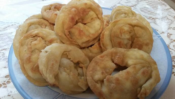 Ανακατεύουμε όλα τα υλικά και φτιάχνουμε ένα μαλακό ζυμάρι. Το αφήνουμε ½ ώρα να ξεκουραστεί και έπειτα ανοίγουμε πολύ λεπτό φύλλο. Κόβουμε το φύλλο σε λωρίδες, απλώνουμε το τυρί μας και διπλώνουμε το φύλλο. Έπειτα σχηματίζουμε ένα κουλούρι και κλείνουμε τις άκρες του. Τηγανίζουμε σε μπόλικο λάδι να γίνουν χρυσαφί.
