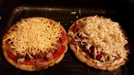 Τηγανίζουμε τις πίτες και τις μεταφέρουμε σε ένα ταψί. Κόβουμε το κρέας σε πολύ λεπτές λωρίδες (σαν γύρο). Βάζουμε στη μία πίτα κέτσαπ ενώ στην άλλη μουστάρδα. Απλώνουμε το κρέας και τη ντομάτα καλύπτουμε τα τυριά. Ψήνουμε στους 180 βαθμούς 10 λεπτά, μέχρι να λιώσει το τυρί.