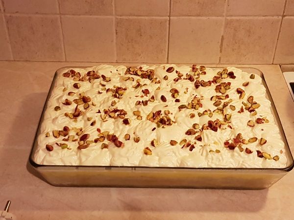 Τέλος, φτιάχνουμε τη σαντυγί σύμφωνα με τις οδηγίες της συσκευασίας. Την απλώνουμε όμορφα πάνω από την κρέμα και γαρνίρουμε με σπασμένα φυστίκια Αιγίνης.